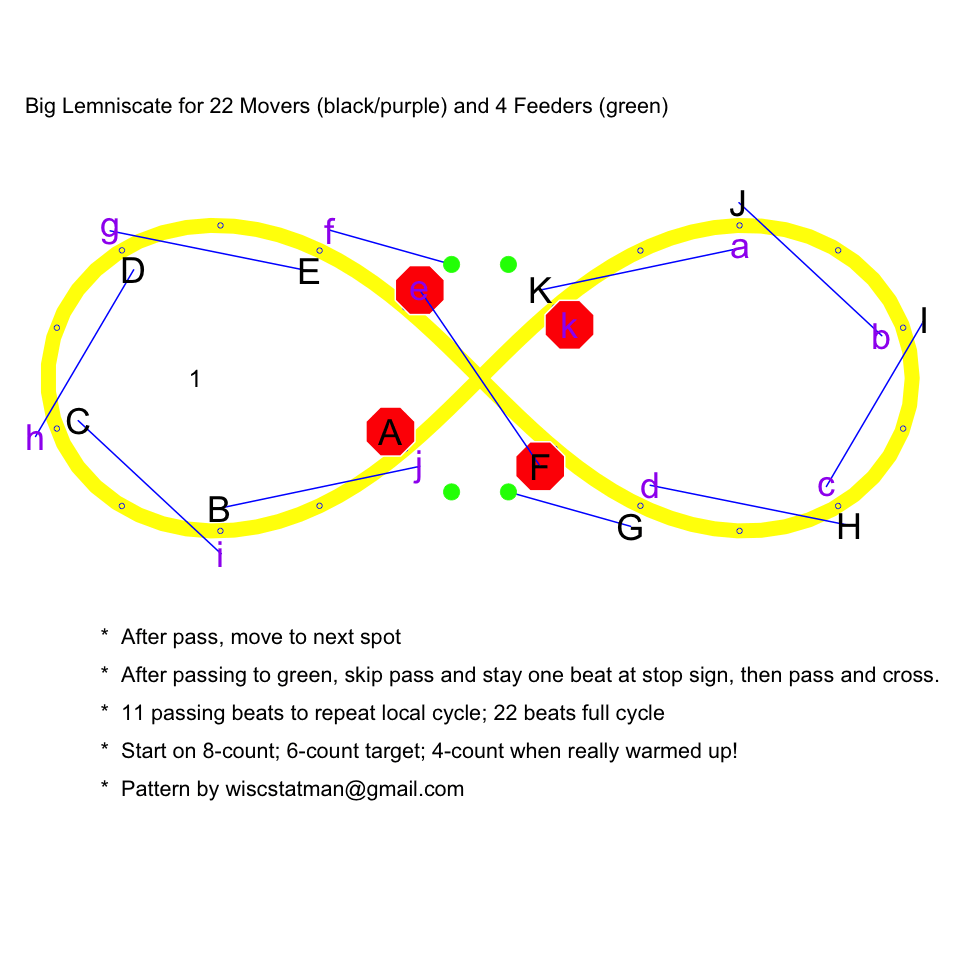 Nothing quite gets the club passing juices going like a well coordinated multi-person moving pattern. If you can pass clubs and do basic moving patterns (e.g. can you do a weave?), we need you in this event. Join us as we attempt the Big Lemniscate, and probably set the record for the biggest cool juggling pattern every performed!