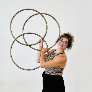 An avid double hooper, Jasmine began her triple hoop journey in August of 2024 experimenting with manipulations and in November of 2024 she started juggling hoops daily.